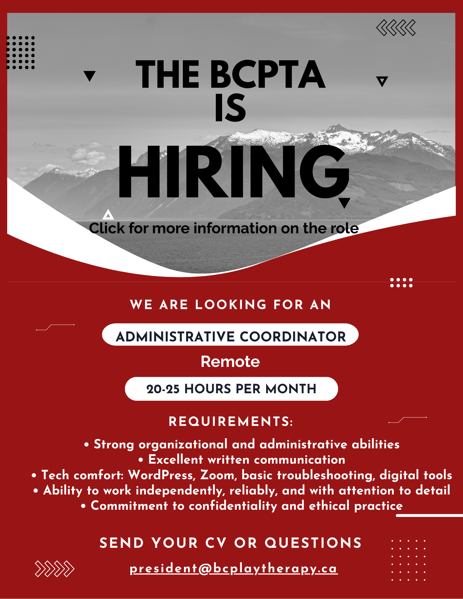 The British Columbia Play Therapy Association (BCPTA) promotes the advancement, training, credentialing, and ethical evidence-based practice of play and child therapists. Through our dedication to the principles of anti-racism and inclusion, the BCPTA aims to foster a community of play therapy professionals who are committed to providing equitable, accessible, and culturally sensitive services to individuals in need. Together, we strive to promote healing, growth, and resilience through the power of play.